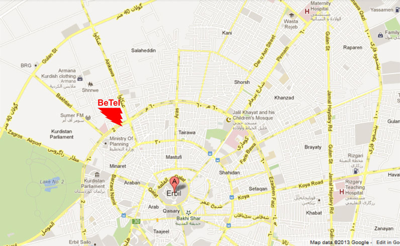 | Phone : + 964 66 2233365 Mobile : + 964 7504452203 Fax : + 31847239365 E-mail : info@betelgroup.net , barzangy@yahoo.com Address : 60 meter’s St. opposite to ministry of justice, Erbil, Iraq click HERE to send e-mail to us